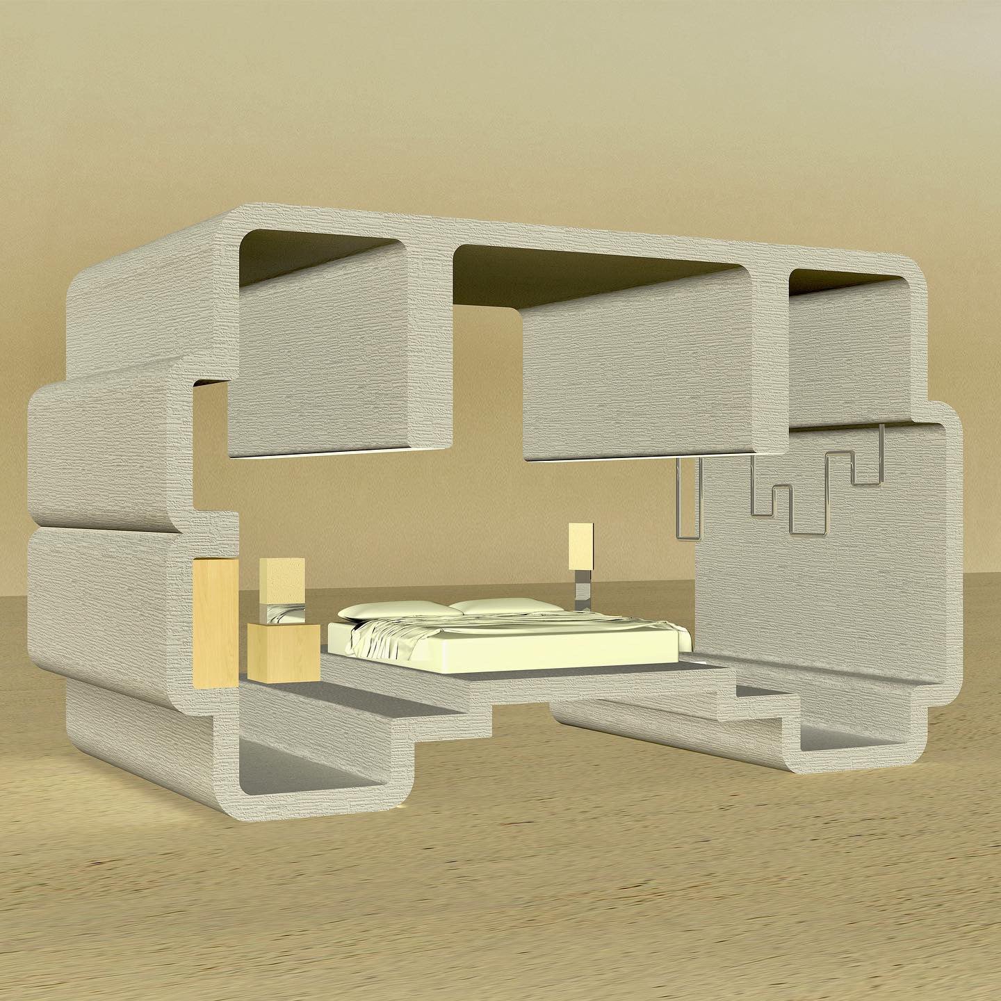 As a spin-off to our first research project 'Ten Chairs', we imagined 5 rooms starting with the kitchen and bedroom. Each room is 3D printed in concrete and surrounded by a natural landscape. It is printed in continuous, spiral motion to create capsule-like and built-in living spaces.