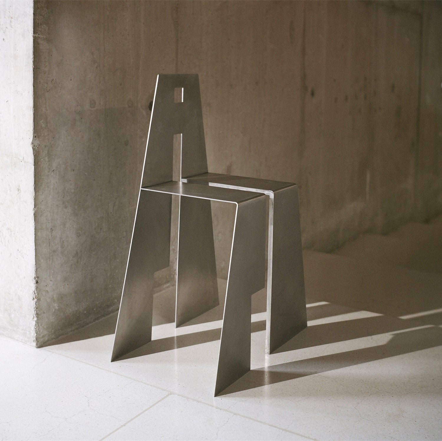 The 'Chaises 1600/1800', are a duo of sculptural chairs, created in stainless steel with a subtle brushed textural finish. The pair are named after the place in which they were inspired, by the work of architect Charlotte Periand at the ski station ‘les arcs’ situated in the French Alps. The chairs are architectural in form and almost futuristic in the design approach. They are intended to stand out as a feature piece in a given space yet also remain simple and modest due to the materials used. The chairs are crafted by a specialised metalworker in Paris, where they are designed.